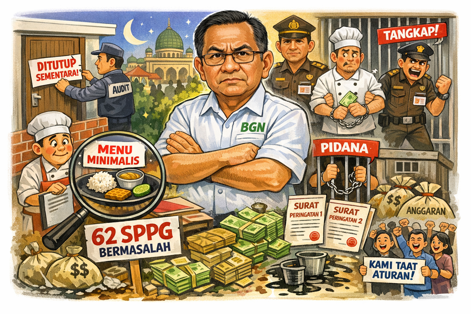 JAKARTA, JURNAL TIPIKOR – Di tengah khidmatnya bulan suci Ramadhan 1447 Hijriah, Badan Gizi Nasional (BGN) terpaksa mengambil tindakan tegas terhadap 62 Satuan Pelayanan Pemenuhan Gizi (SPPG) yang tampaknya salah mengartikan konsep “sederhana”.