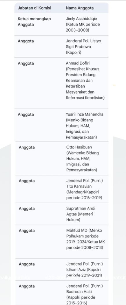 • Kolaborasi: Komisi juga akan bersinergi erat dengan tim internal yang telah dibentuk oleh Kapolri, yang berfokus pada perbaikan manajemen di lingkungan kepolisian.